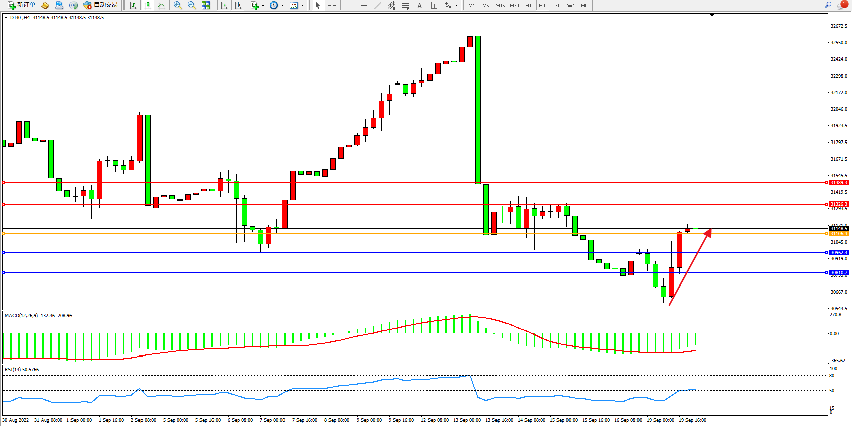 道琼斯指数9月19日(周一)收盘上涨197.26点,涨幅0.64%,报31019.68点;高盛下调2023年美国国内生产总值预期,原因是美联储将在今年剩余时间内采取更积极的紧缩货币政策,并认为这将推动失业率高于此前预期。