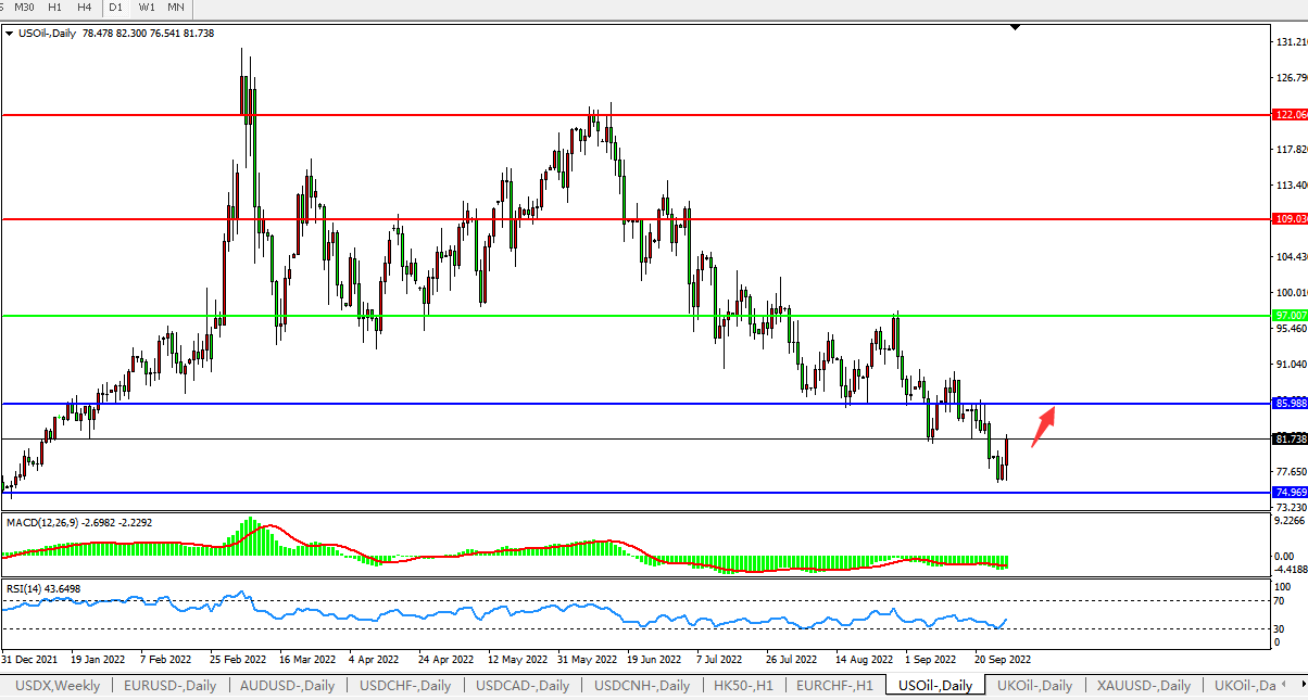 日线图看:油价持续拉升, MACD量能柱0轴下方开始缩量,RSI指标小幅走强,短期油价继续反弹概率增大。