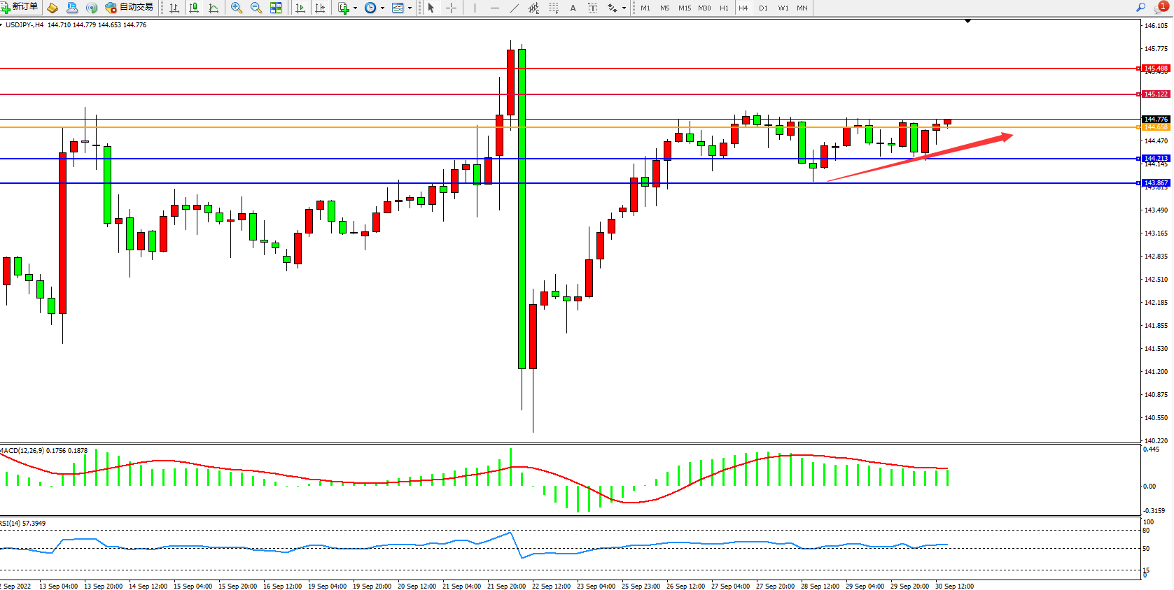 4小时图看:短期多头震荡上移后,高位窄幅区间震荡,多头动力有伺机入场迹象,但首次依旧有偏弱势,MACD指标处于0轴线上側窄幅整理,RSI指标处于50均衡线上側弱势徘徊;