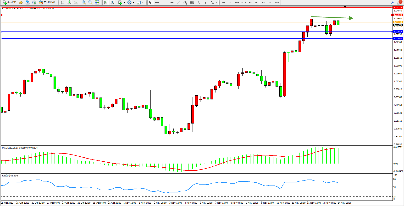 欧元美元EURUSD—4小时K线图显示: