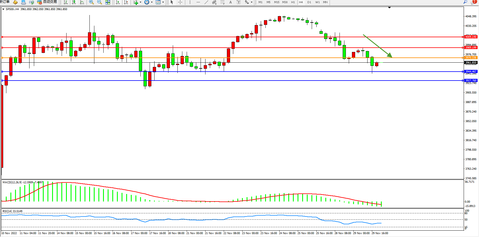标普500指数11月29日(周二)收盘下跌6.84点,跌幅0.17%,报3957.10点;美联储主席鲍威尔可能在即将到来的讲话中进一步暗示加息步伐放缓,通胀降温迹象都很可能会强化人们对美联储采取不那么激进利率政策的预期。