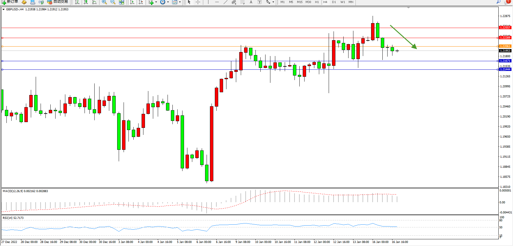 交易策略:1.22061下方看跌,目标1.21671、1.21444