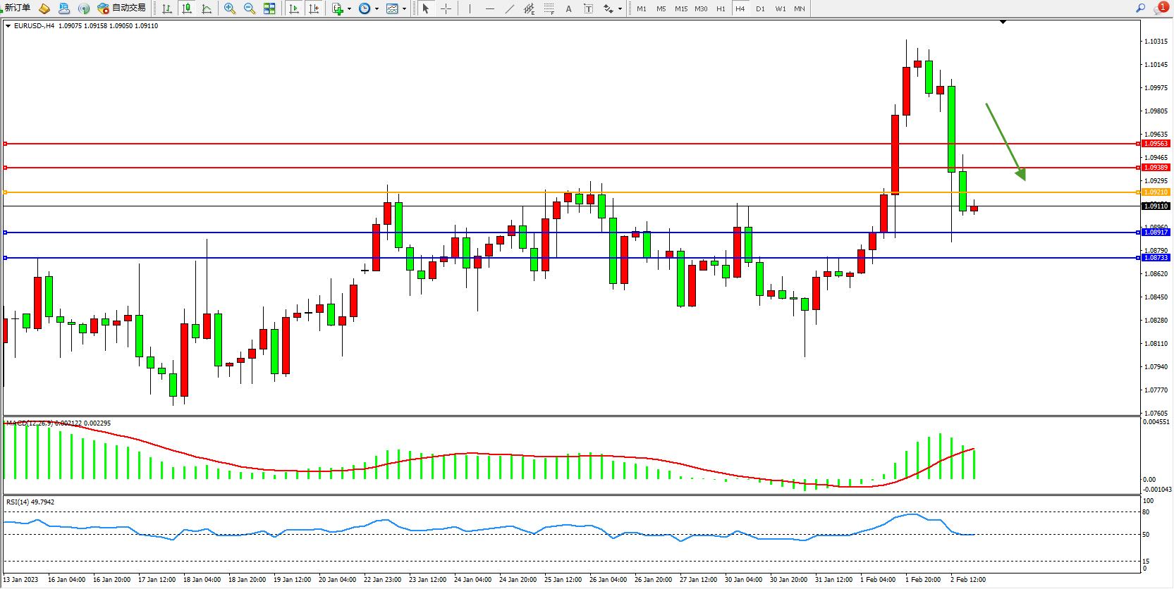 欧元兑美元维持1.09110附近震荡,欧元区至2月2日欧洲央行主要再融资利率 3%,预期3.00%,前值2.50%,符合市场预期,自去年7月以来共加息300个基点,主要再融资利率达2008年11月以来最高水平。