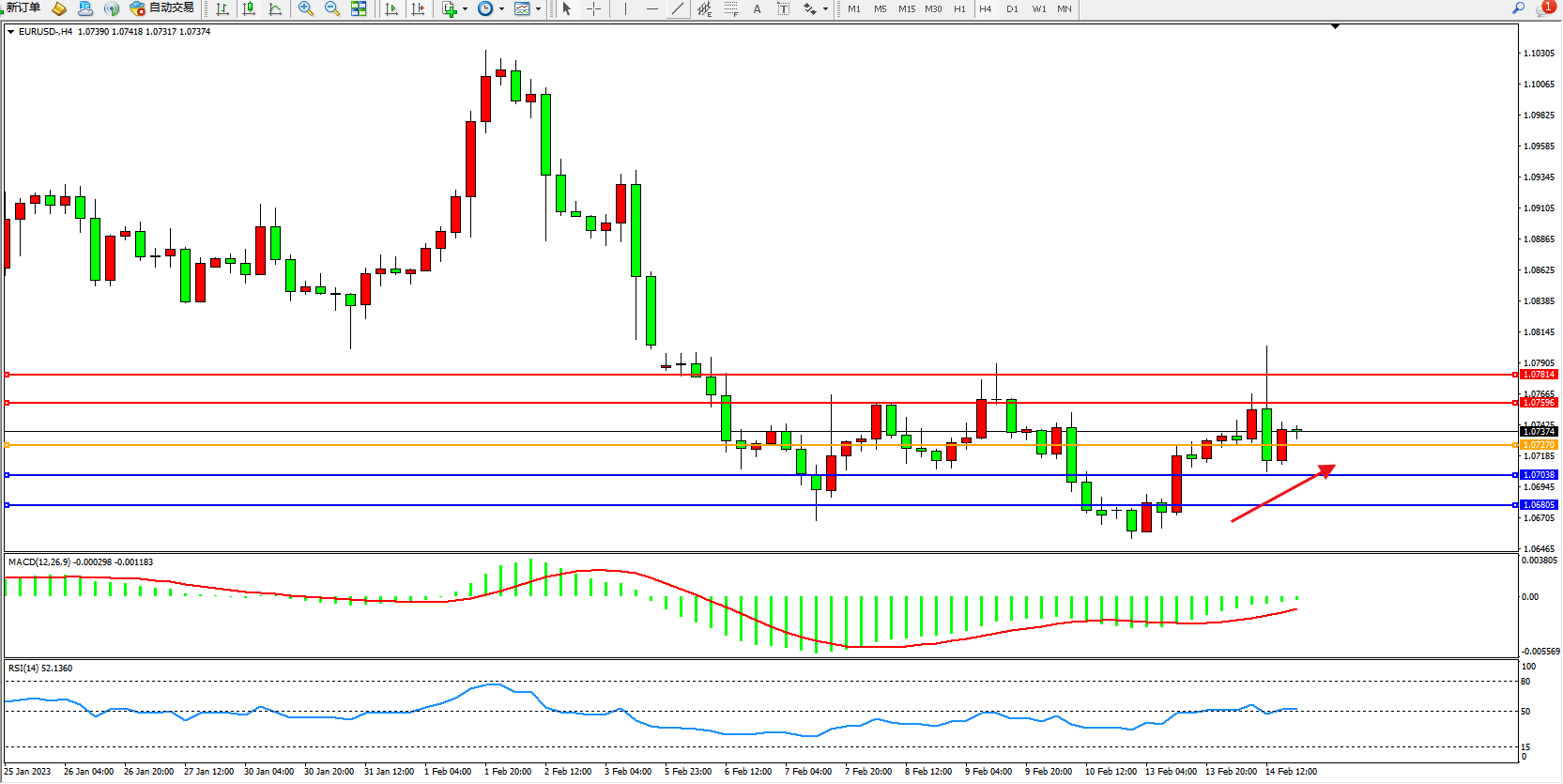 欧元美元EURUSD—4小时K线图显示: