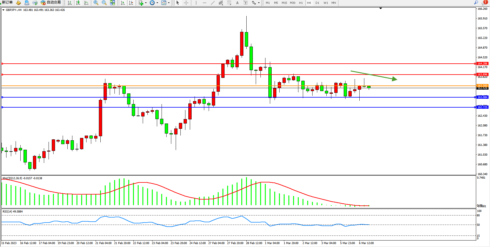 4小时图看:短期高位弱势整理,市场整体处于偏弱势,短期有继续徘徊下移迹象,MACD指标处于0轴线附近弱势徘徊,RSI指标处于50均衡线附近弱势整理;