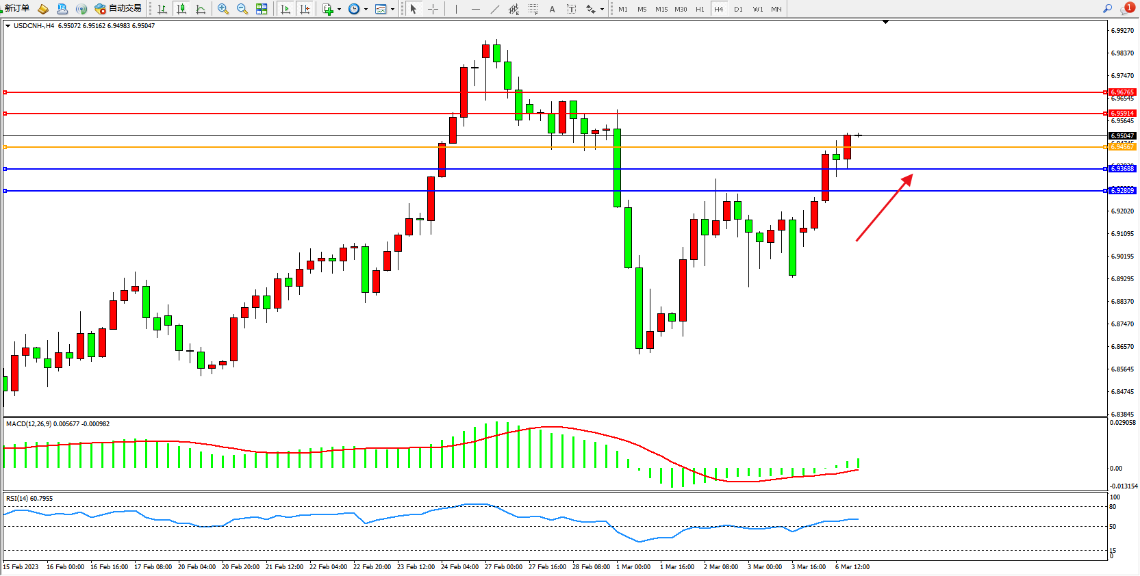 交易策略:6.94567上方看涨,目标6.95914  6.96765