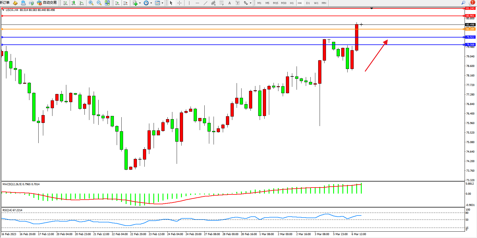 4小时图看:多头高位持续震荡拉升,市场看涨情绪涌现,短期看涨趋势依旧,MACD指标处于多头区域持续整理缓慢上移,RSI指标处于多头区域维持徘徊;