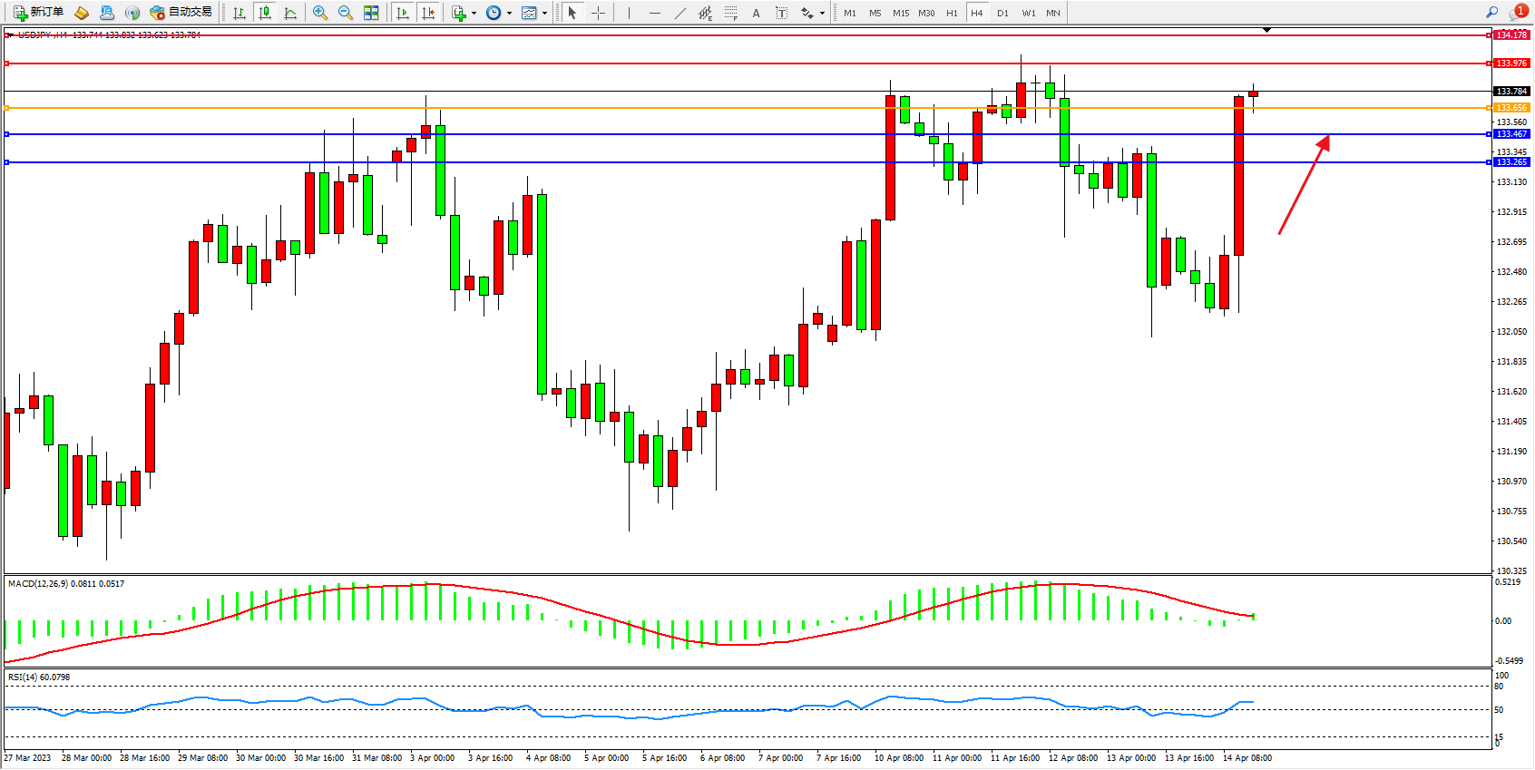 4小时图看:多头动力强势拉升上扬,市场看涨情绪笼罩,短期多头有继续向上移动态势,即将触及前期高位节点,MACD指标处于0轴线附近弱势整理,RSI指标处于50均衡线上側徘徊;
