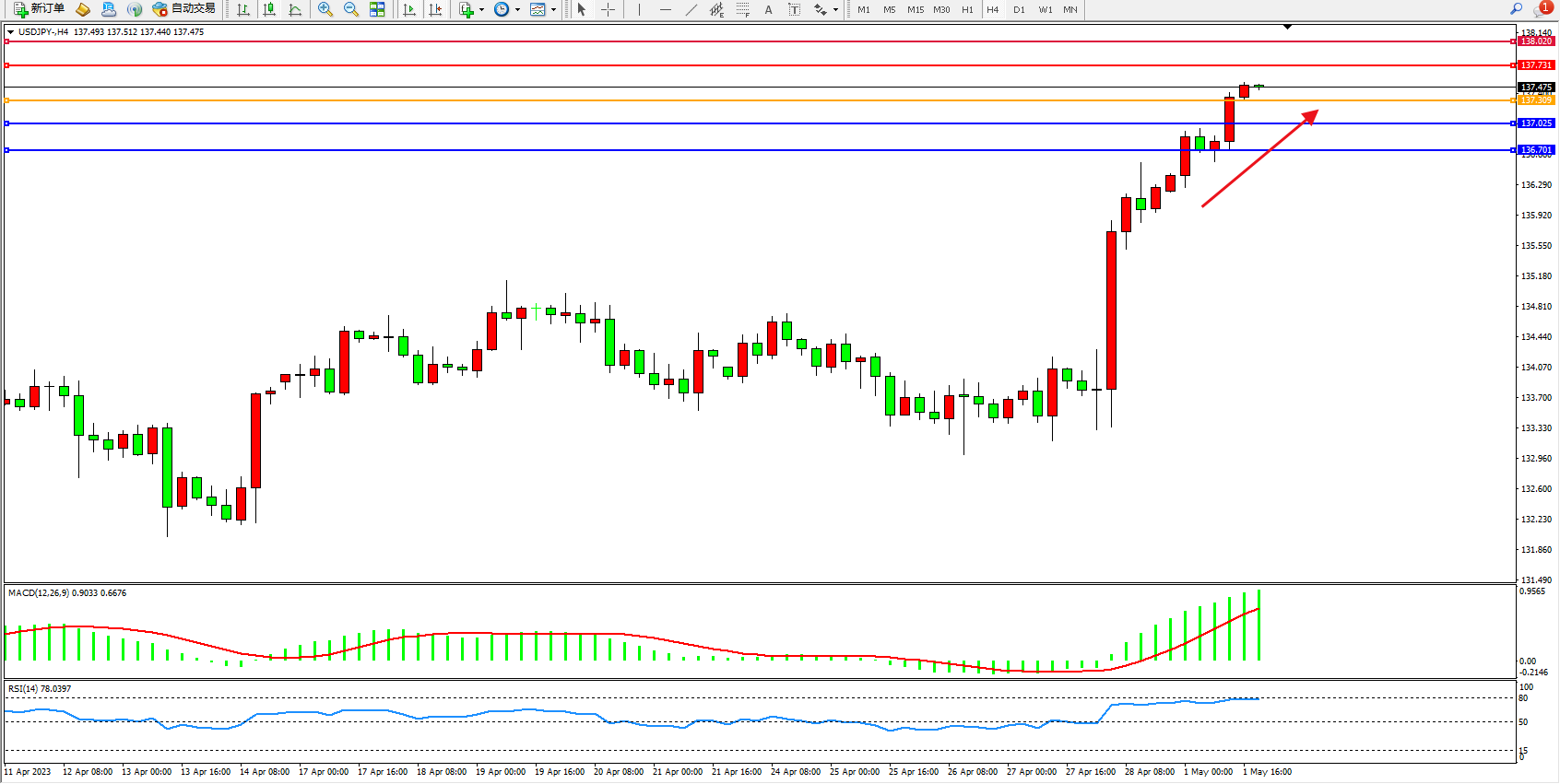 4小时图看:高位多头动力持续震荡上扬,短期看涨情绪依旧,市场多头动力不断攀升中,MACD指标处于多头区域持续上扬,RSI指标处于多头区域超买区80均衡线附近整理;