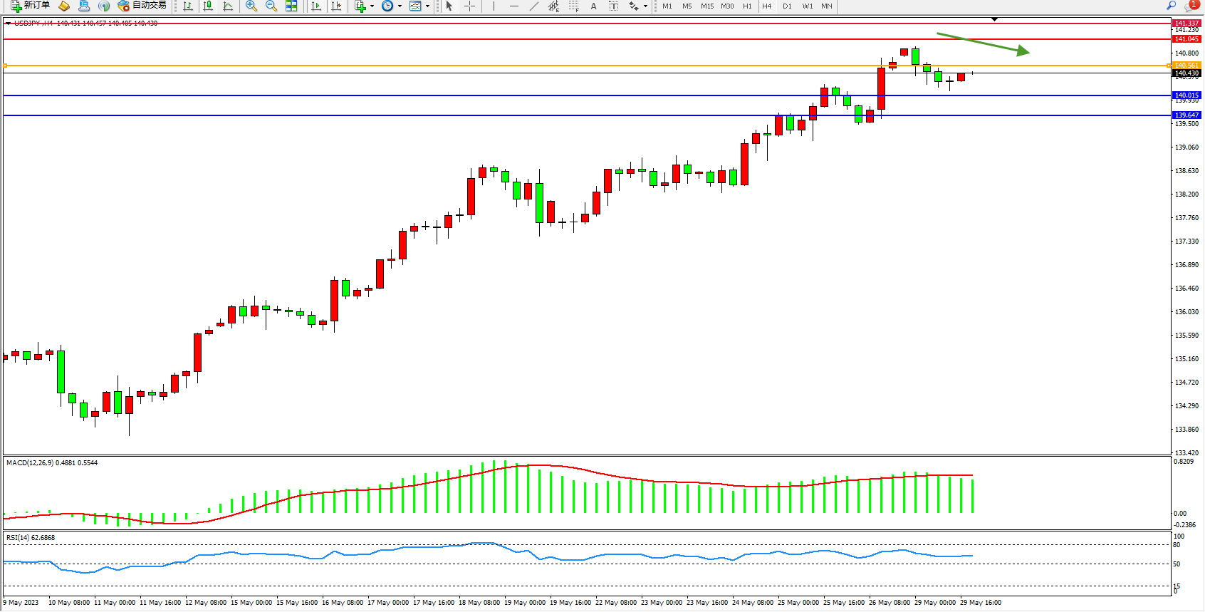 交易策略:140.561下方看跌,目标141.045  141.337