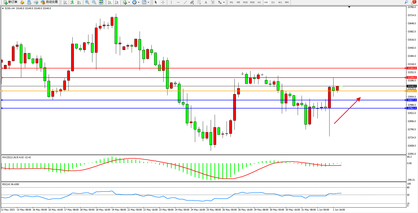 道琼斯指数6月1日(周四)收盘上涨154.09点,涨幅0.47%,报33062.36点;美国5月27日当周首次申请失业救济人数 23.2万人,预期 23.5万人,前值 22.9万人。美国至5月27日当周初请失业金人数为至2023年4月29日当周以来新低。
