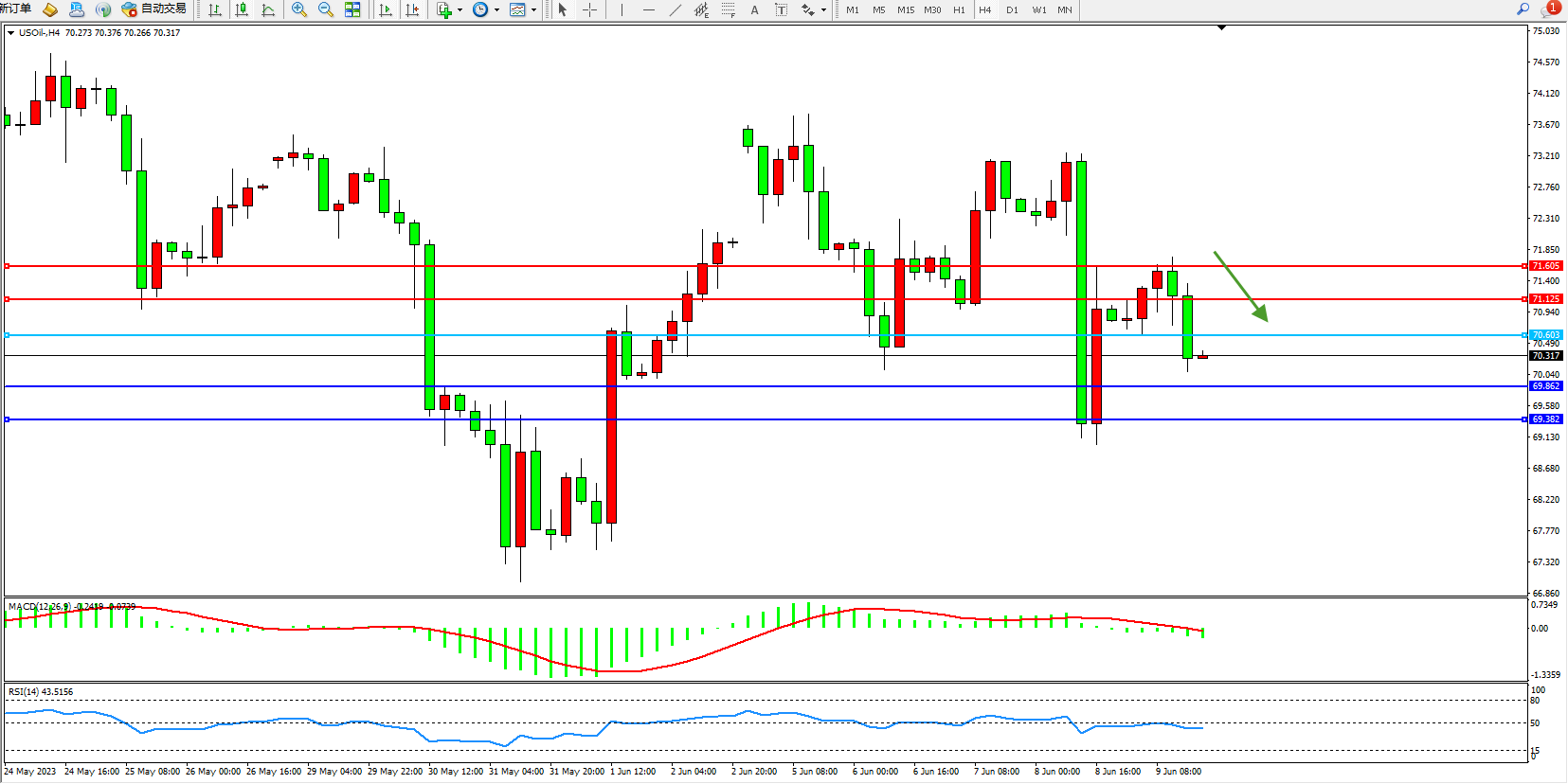 4小时图看:空头动力震荡向下移动,短期跌势或将延续,市场整体处于宽幅走势中,MACD指标处于0轴线下侧弱势徘徊,RSI指标处于50均衡线下侧弱势整理;
