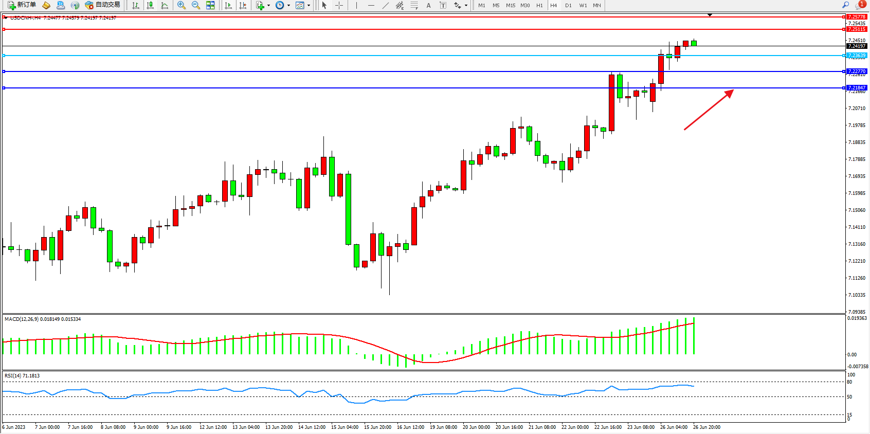 交易策略:7.23639上方看涨,目标7.25115 7.25778