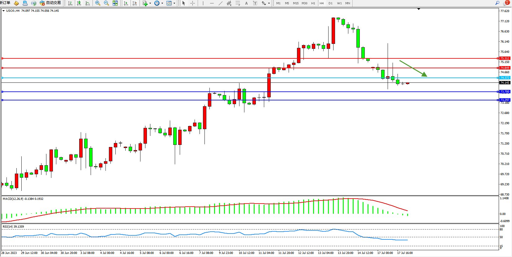 原油维持74.154附近震荡,中国二季度经济增长弱于预期,且利比亚停摆油田中的部分恢复生产。尽管俄罗斯和沙特合作减产的努力限制了油价跌势。