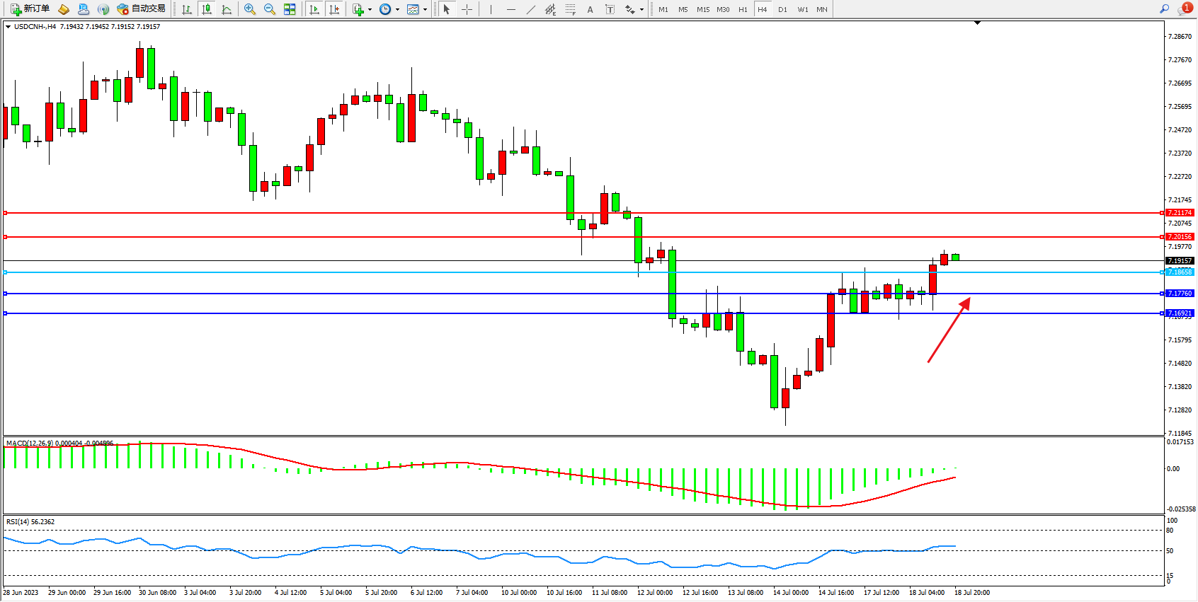 交易策略:7.18658上方看涨,目标7.20156  7.21174