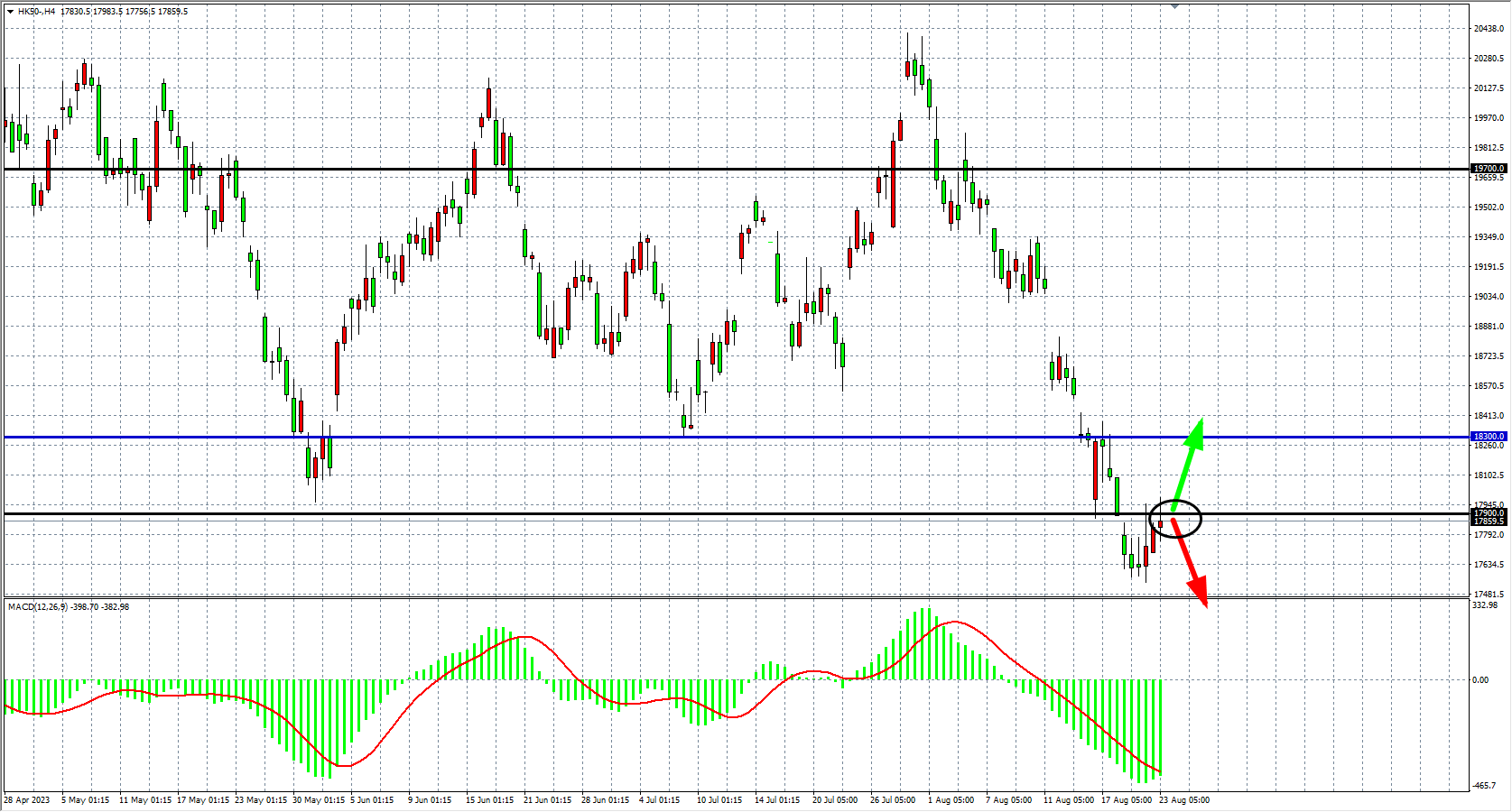 4小时图看,恒指反弹17900附近再度受阻,MACD量能继续于零轴下方,阻力依旧关注17900-18300。