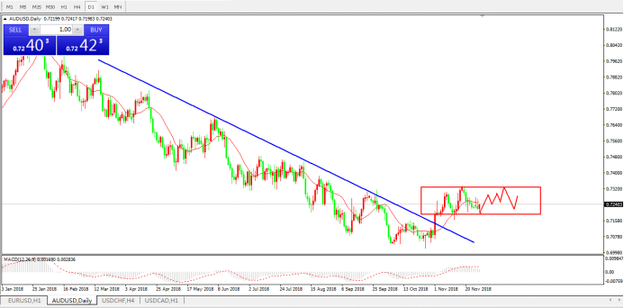技术面简析:D1周期中,价格坚决突破下降趋势线后多日整理蓄势。均线系统看,连日整理使得短期均线MA5,10,20开始上穿MA40,60并持续运行于其上方,汇价有轻微走强迹象。关注整理区间,高抛低吸。