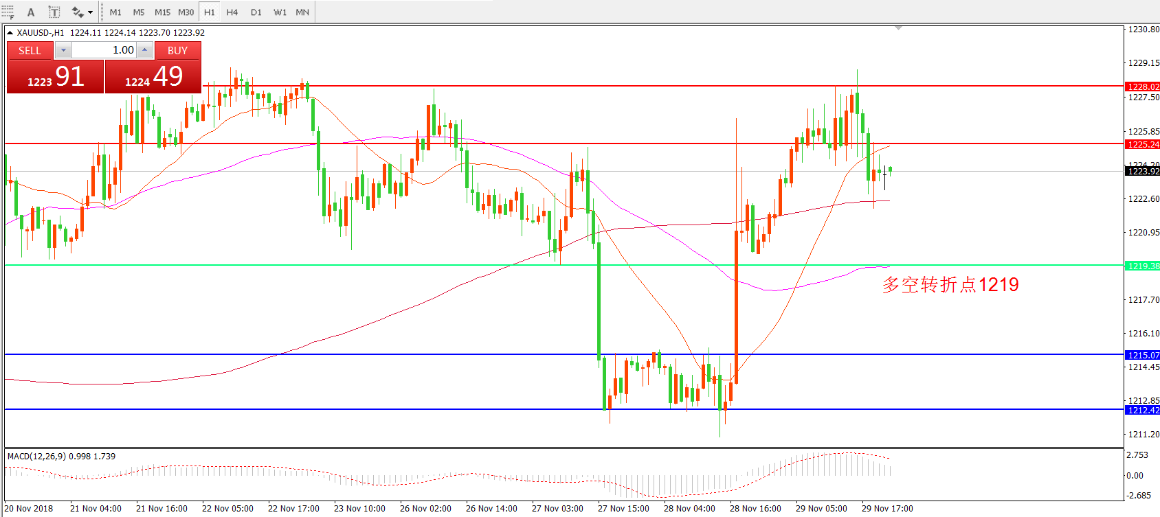 小时图看,黄金突破前期阻力后连续上行,测试1228一线阻力后小幅回落,但价格整体位于55周期均线之上,MACD红柱减少,操作上依然以逢低做多为主。