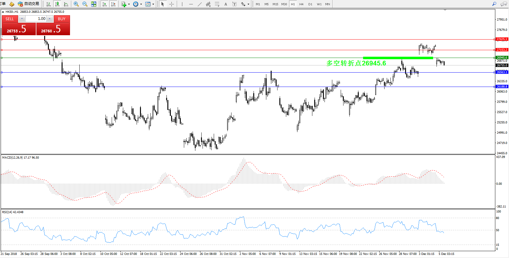 周一金融市场喜迎开门红,中美两国股市涨势喜人,带动恒生指数亦跳升至27000关口上方,情势一时转好。周二晚间纽约联储主席威廉姆斯在地区经济会议还是强调了美联储不会放弃“渐进式加息”,其强硬言辞使得市场对明年加息路径再次充满期待,有进一步推动了美股的下行,也抑制了恒指继续反弹的动力。在利好与利空之间,恒指涨势放慢,下跌也会受限,关注事态的继续发展,等待破局。
