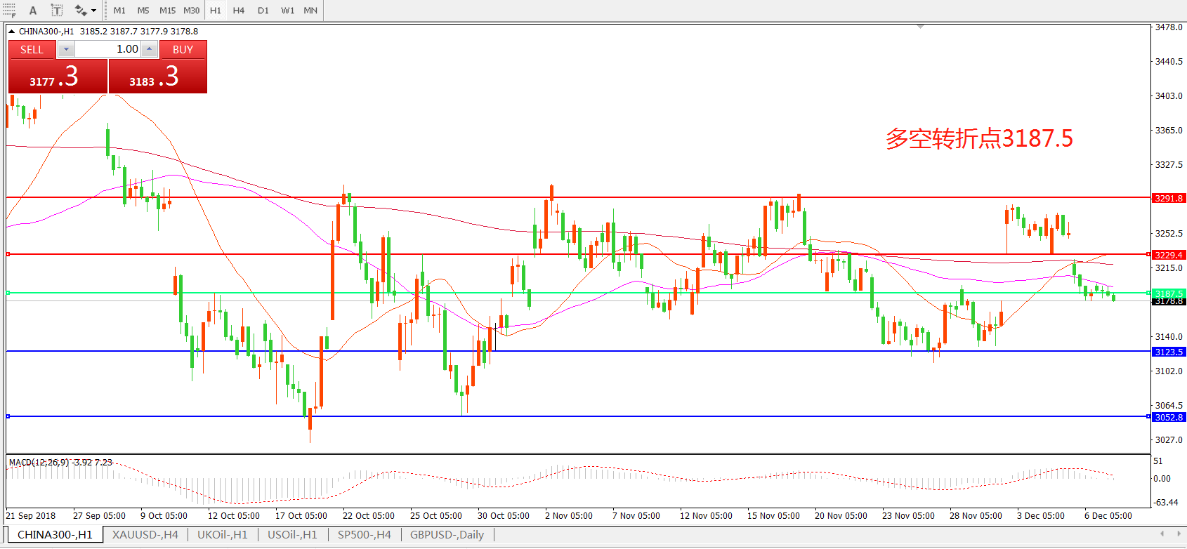 1小时图看,CHINA300中华指数持续下行,整体价位跌至均线系统之下,MACD红柱缩短,日内走势以弱势震荡为主。