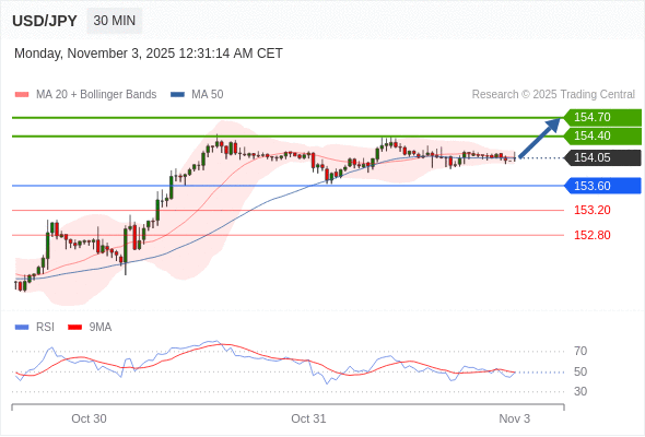 在 153.60 之上,看涨,目标价位为 154.40 ,然后为 154.70 。