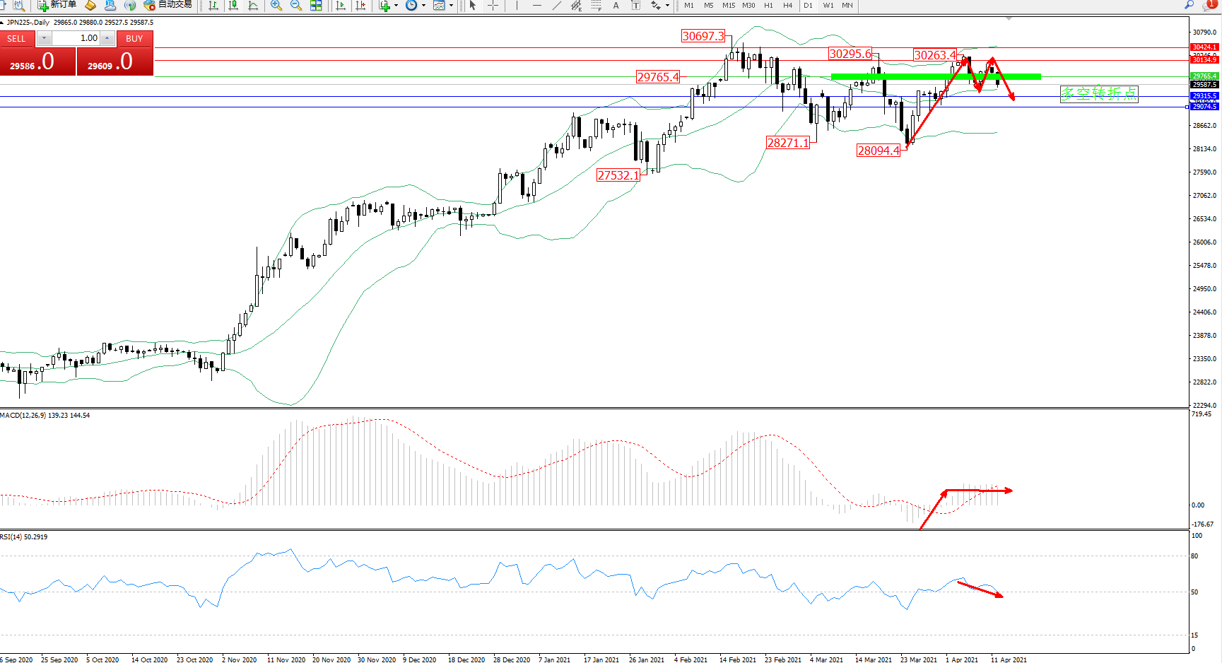 技术点评:长时间维持在布林带指标通道内宽幅震荡持续中,期间多次来回试探上下轨区间节点,多头动力上行至30263位置后遇阻回撤,触及布林带指标中轨附近节点后开始震荡,空头动力有继续下移迹象,MACD指标处于0轴线上方多头区域维持震荡后有回撤迹象,RSI指标处于50均衡线上方多头区域维持震荡后反转急速下行中;
