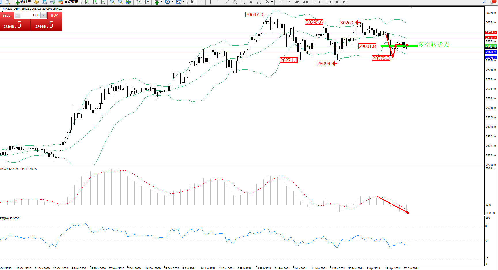 技术点评:长时间维持在布林带指标通道内处于宽幅震荡走势中,空头动力司机入场跌破布林带指标下轨附近节点后不断向下移动中,低位抵达28375附近得到短暂支撑多头伺机入场,反转回升后整理平移,布林带指标呈张口走势后开始收口,但仍处于下轨附近弱势震荡中,MACD指标处于0轴线下方维持震荡平移,RSI指标空头动力弱势纠结于50均衡线下方空头区域弱势整理;