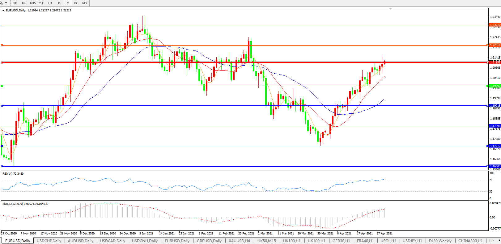 技术面简析:日图均线呈多头排列,汇价持续发力上行,MACD上穿0轴且量能有持续放量迹象,RSI攻入超买区域,预计短期汇价大概率将在整理后进一步上行。