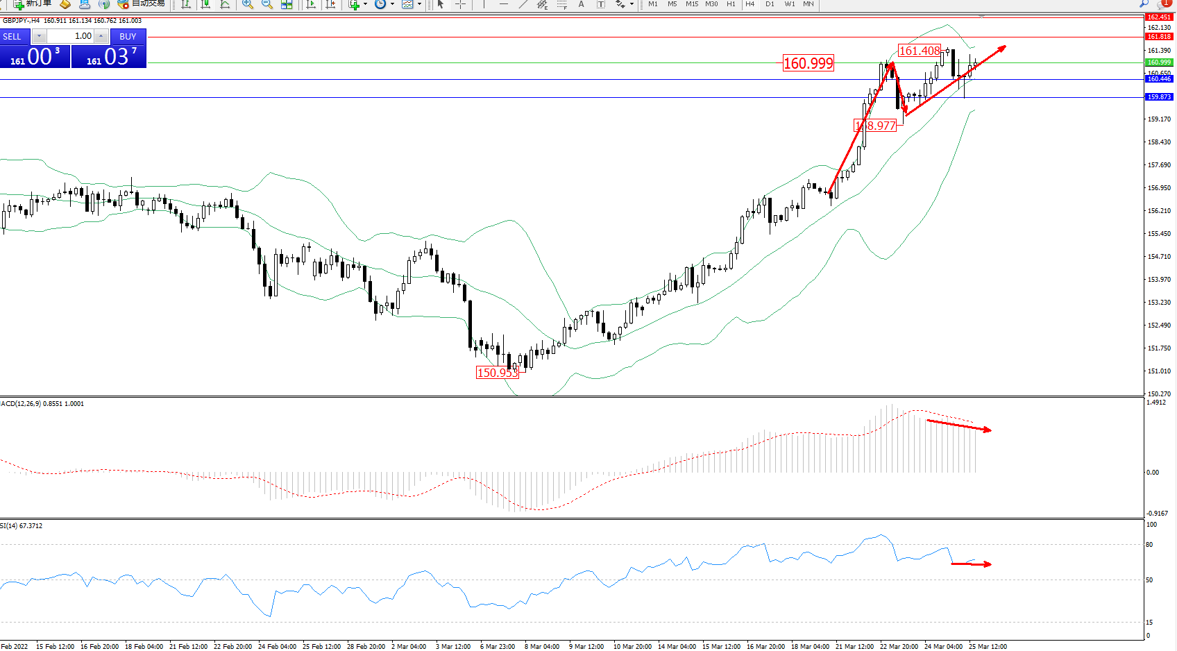 技术点评:多头动力延续布林带指标通道中上轨区间持续震荡上扬,高位抵达161.408附近节点开始震荡,短期高位维持震荡向上移动走势持续中,布林带指标呈收口走势中,MACD指标处于多头区域维持整理平移,RSI指标处于多头区域维持整理徘徊中;