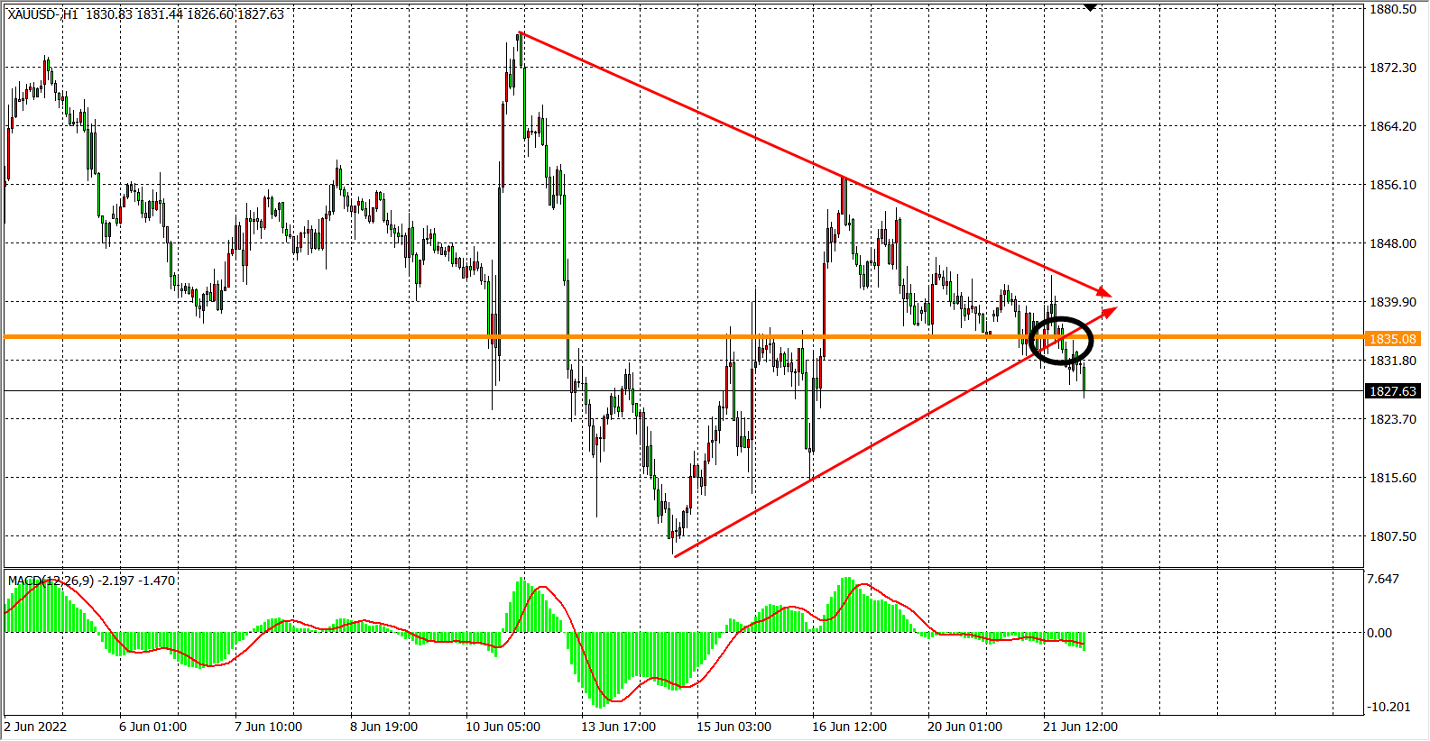 1小时图看,金价已跌破三角形整理区间,趋势重新回归下行,同时MACD柱体于零轴之下呈放量形态,预示价格有进一步回跌风险。日内以1835为多空分界点,在1835之下继看跌为主,目标1820-1805,破位后看更低