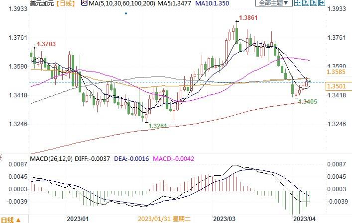 美元兑加元(1.3505, -0.0002, -0.01%)日线图北京时间4月10日14:54,美元兑加元报1.3494/96
